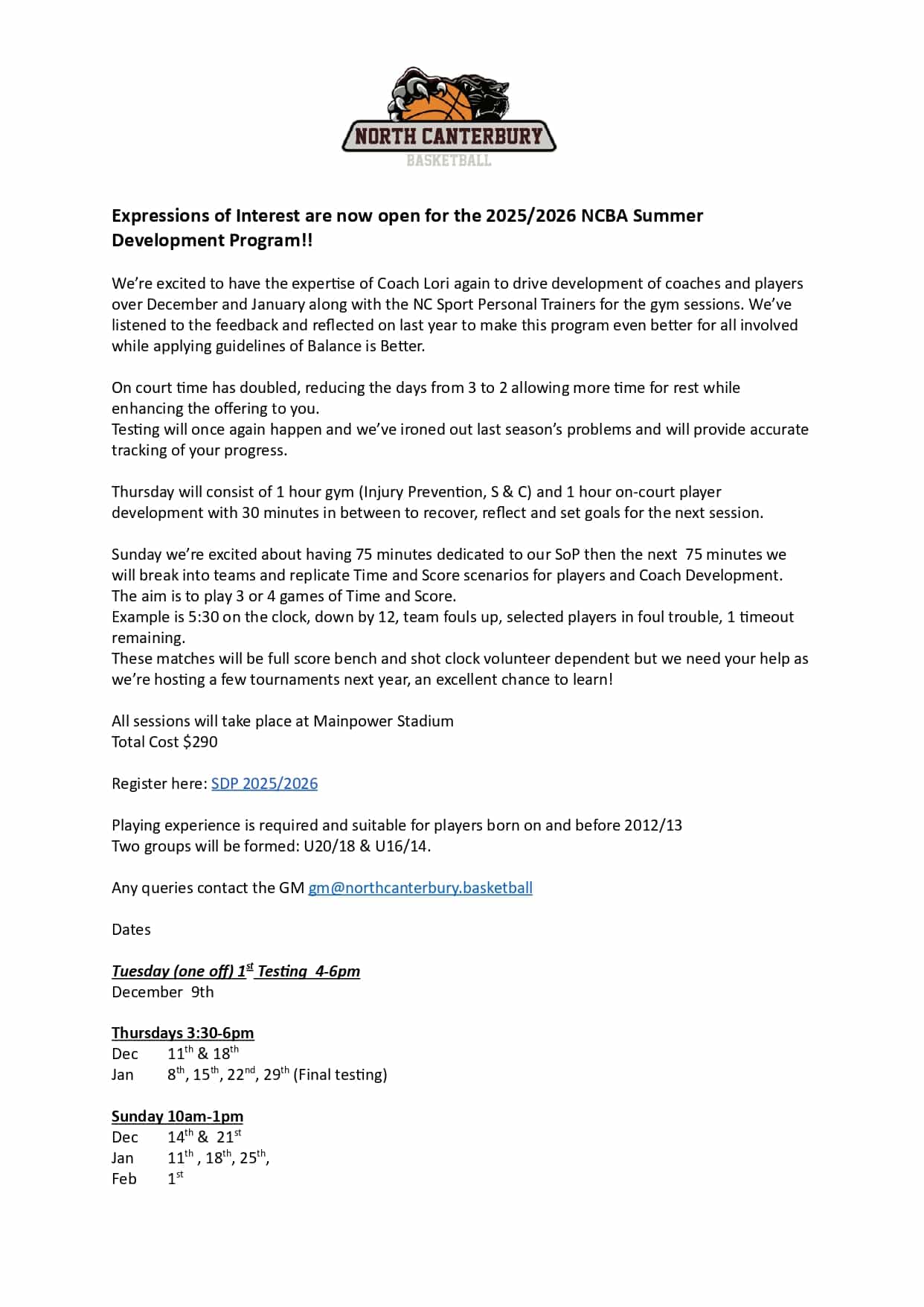 Any queries please contact - gm@northcanterbury.basketball